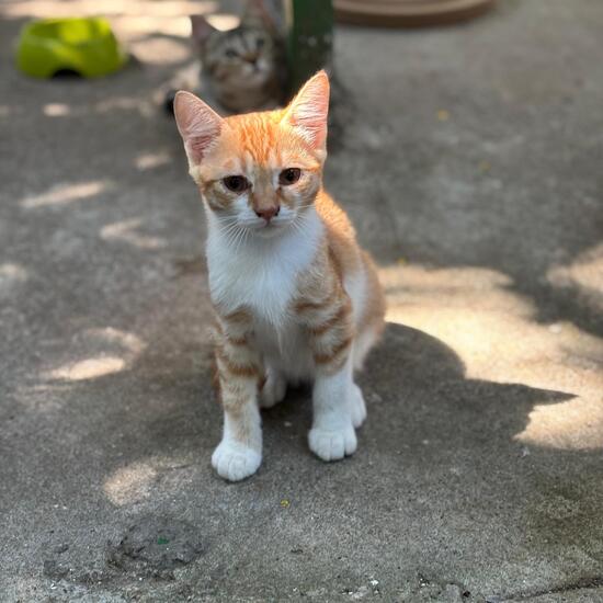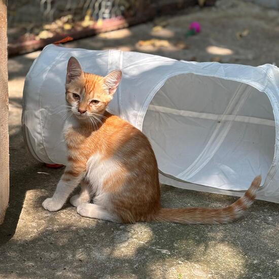 Katzen bei. Er erkundet aktuell noch vorsichtig das Katzengehege.