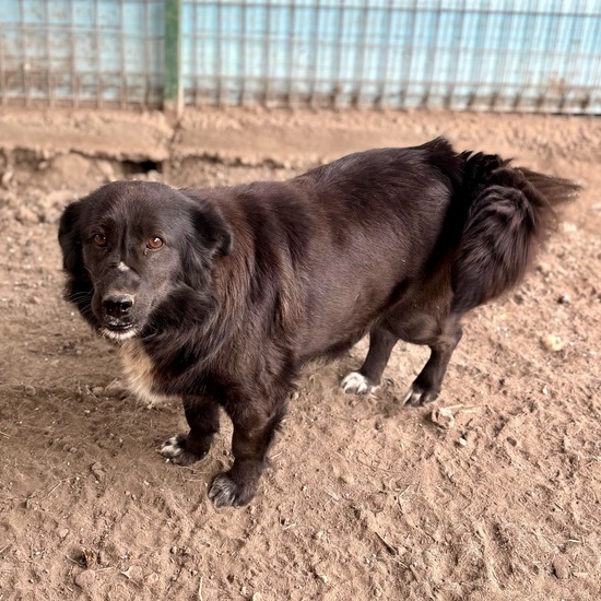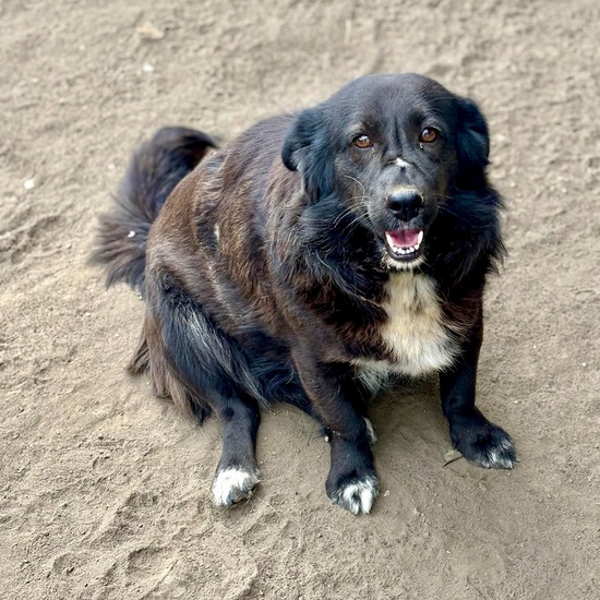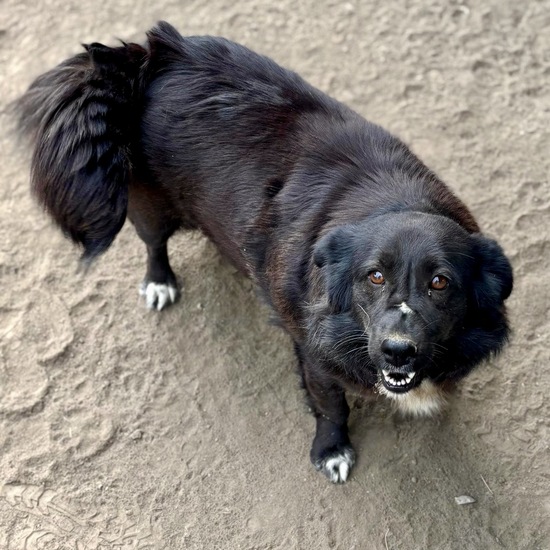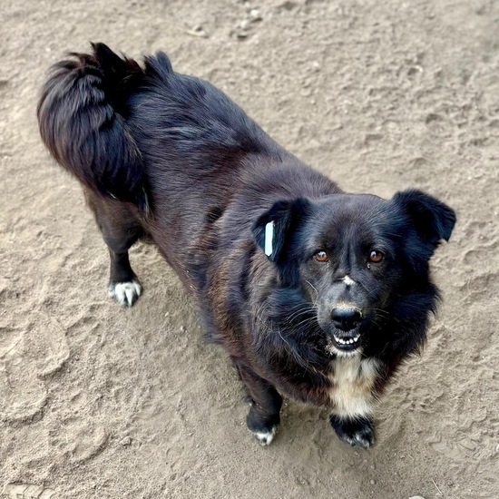 Mit ihren ca. 45 cm Schulterhöhe, dem dichten, schwarzen Fell und den lustigen weißen „Farbpfötchen“ ist sie eine richtige Schönheit. Auf der Nase trägt sie eine Brandmarke – ein trauriges Überbleibsel eines alten Aberglaubens in Rumänien, wonach Hunde durch solch eine Verbrennung angeblich vor Krankheiten geschützt würden. Für Asha ist es heute nur noch ein äußerliches Merkmal, das sie in keinster Weise einschränkt.