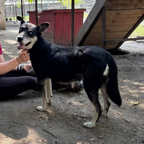 Ninga hat zwar die hellen blauen Augen eines Husky´s, zeigt aber ein mildes, gut zu händelndes Temperament. Auch ihre Wesenszüge empfinden wir als angenehm. Sie mag Männer wie Frauen, geht zügig und freudig angeleint voran, ist kein Angsthase, bleibt ansprechbar und fällt durch ihre Unkompliziertheit irgendwie auf.