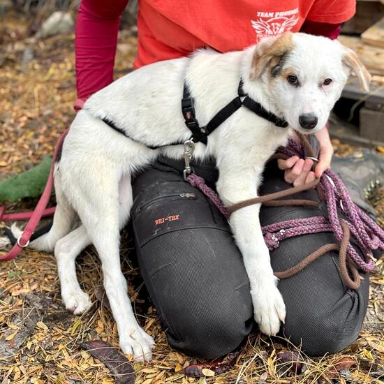 Nett und planlos wie Dino ist, hat er seinen ersten Gassigang mit uns gemeistert. Die Hauptprobe ist nun bestanden, auch wenn das ganze Geleine und Geschirr ihn verwirrt hat. Ist ja auch bald mehr Geschirr und Zeug als Hund 😉 Naturgemäss ist Dino von der großen weiten Welt beeindruckt und findet gleichzeitig alles spannend. Es wird geschnüffelt und geguckt, um dann wieder Bautz! übers Gekabel zu denken. Dann bleibt man wieder sitzen … 🙂