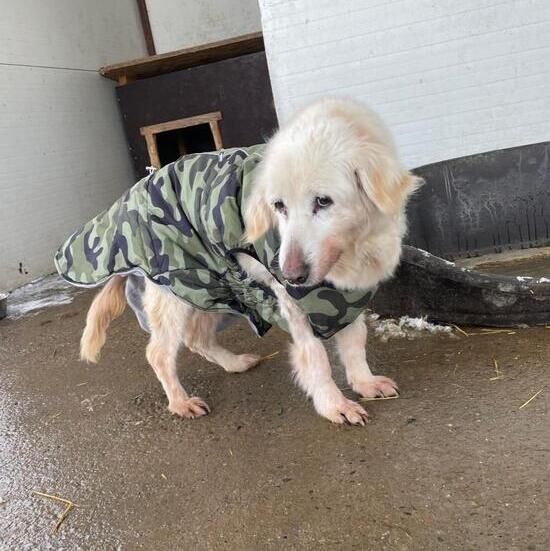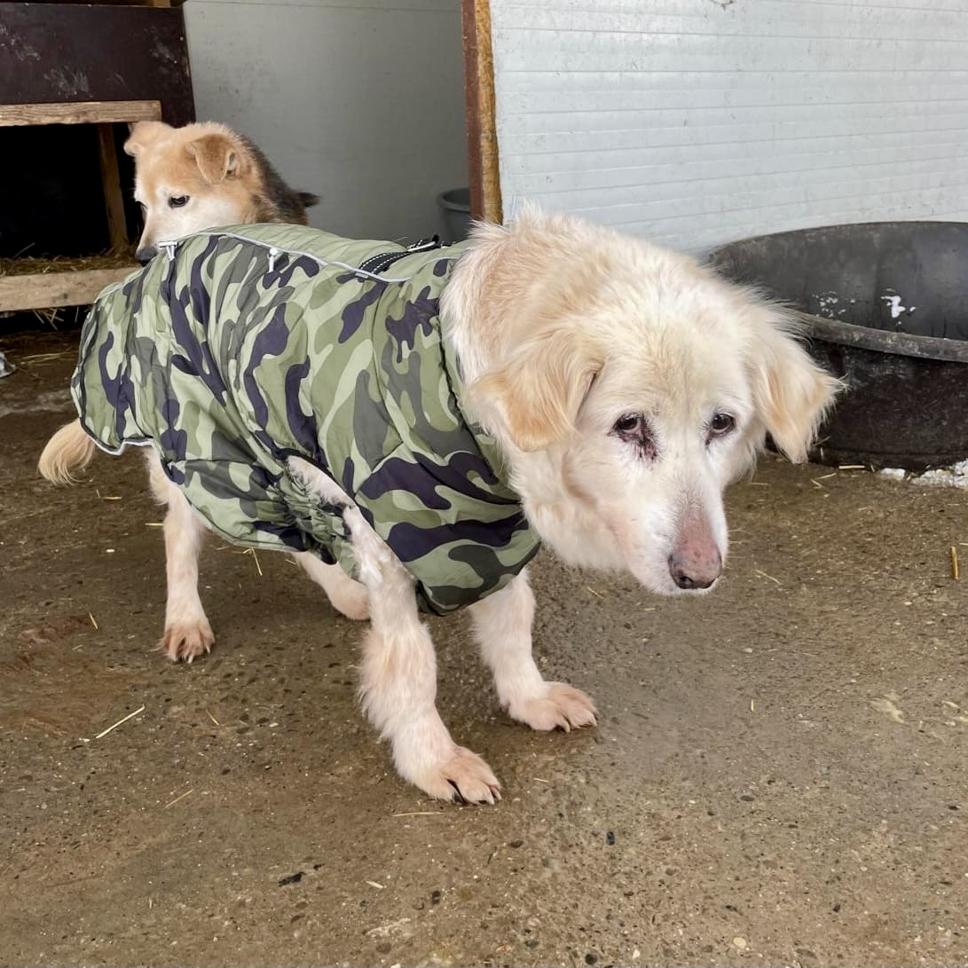Ein warmer Platz, Ruhe und gutes Futter. Und täglich Tabletten gegen das eine oder andere Alterzipperlein. Das macht sie brav. Auch sonst ist sie lieb, lässt sich kraulen, läßt sich den Hundemantel anziehen, der sie wenigstens ein bisschen mehr schützen soll.