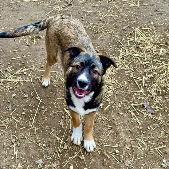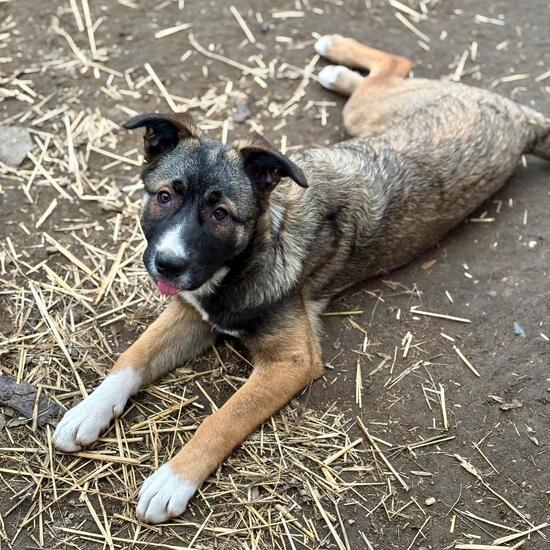 Und dann dieses Aussehen: Minerva muss sich wohl gedacht haben, warum sich auf eine Farbe festlegen, wenn man einfach alle haben kann. Braunes Fell, schwarze Akzente im Gesicht, ein dunkler Kopf mit weißer Nase und dazu noch weiße Pfötchen – ein bisschen gestromt hier, ein bisschen Kontrast dort. Das Ergebnis ist eine absolut zauberhafte Hündin, in die man sich schlichtweg verlieben muss.