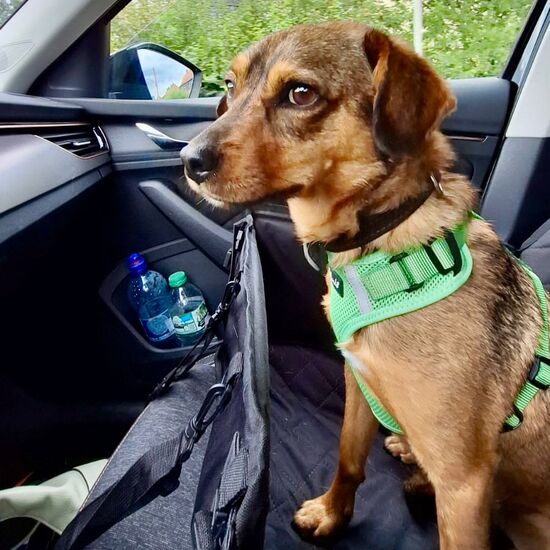 Draußen ist beschreibt Frauchen ihn schnüffelfreudig, der Rückruf funktioniert mit Motivation gut, kann jedoch durch spannende Gerüche beeinträchtigt werden. Grundkommandos wie Sitz, Platz und Fuß kennt er. Autofahren klappt problemlos.